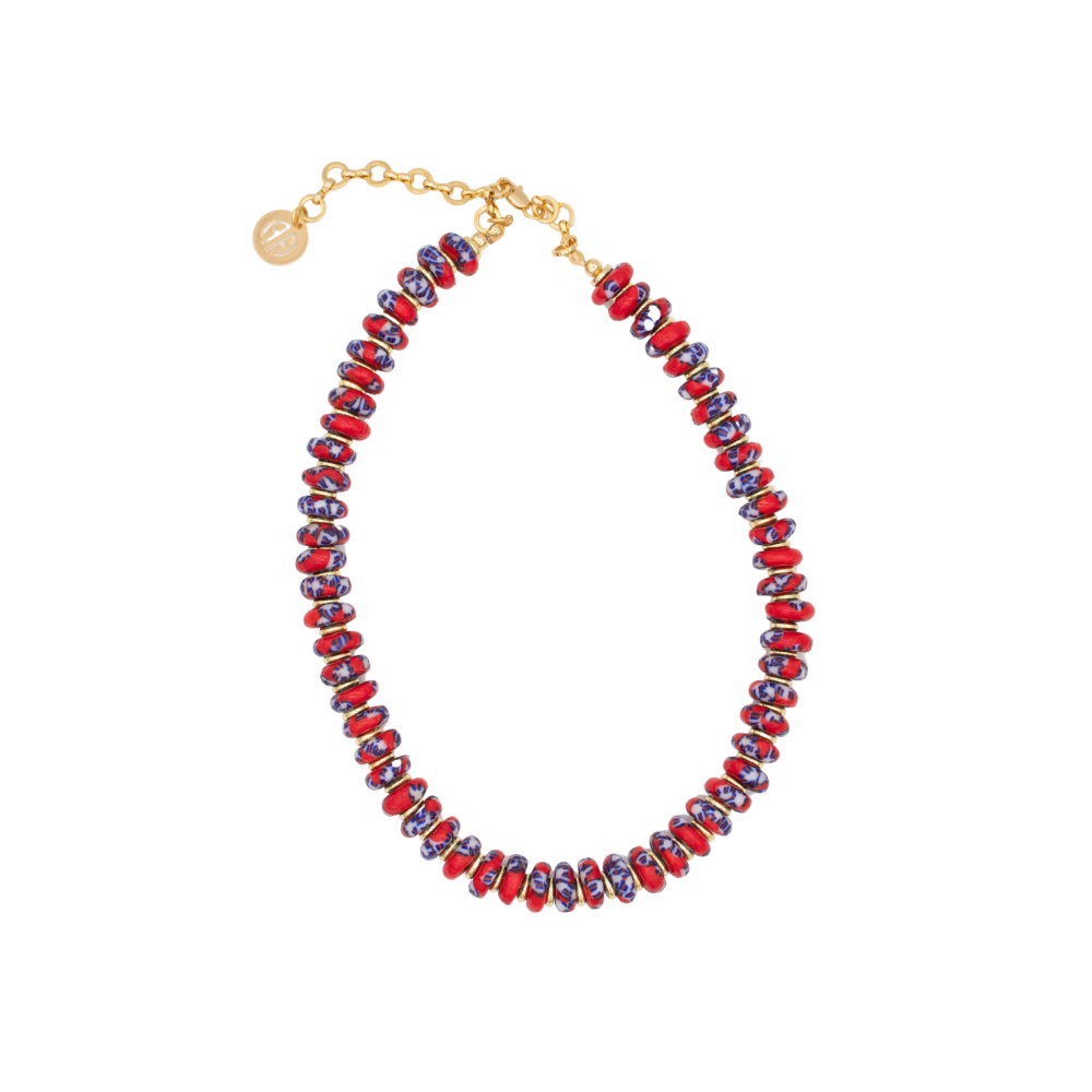 Inspired by the free-spirited essence of boho beach chic style, the Coral Soul Boho Necklace is a one-of-a-kind piece that captures natural beauty and ancestral craftsmanship. This necklace is handcrafted with Coral Fused Rondelle recycled glass beads (11 mm), made in Africa using traditional techniques that date back over 1,000 years.
