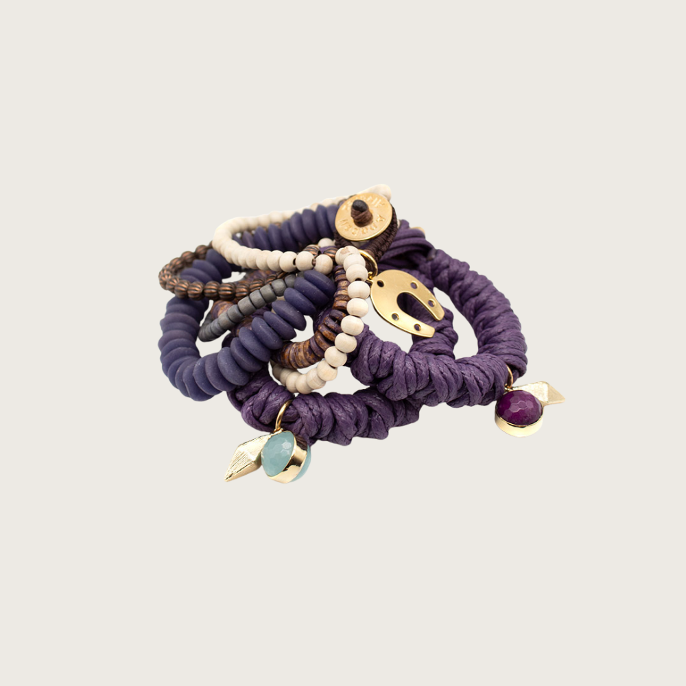Complementing the rich purple tones are natural white bone and wood beads, paired with luminous labradorite accents that add an organic, earthy elegance. The strands are carefully woven with soft brown cotton nylon threads, creating a comfortable fit and a natural aesthetic.
